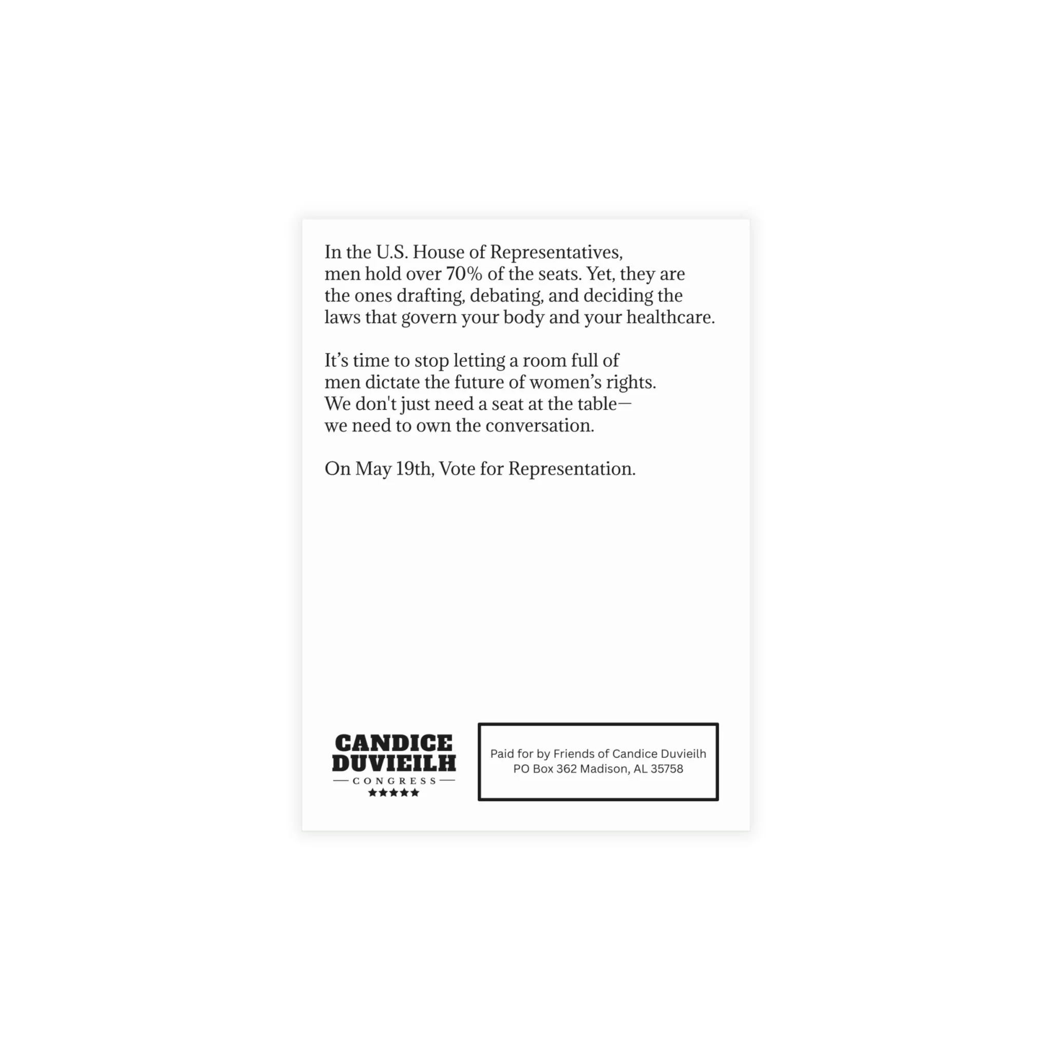 Every item here supports a fresh voice with real values. When you purchase from this store, the full amount is a contribution to Friends of Candice Duvieilh and counts toward federal limits. For the 2025–2026 cycle, individuals may give up to $3,500 per election to a candidate committee. The primary and general are separate elections. Contributions are not tax-deductible.
